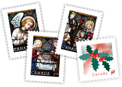 Canada Post today issued four new stamps for the holiday season, including a three-part set featuring historic stained-glass windows of the Cathedral of Saint-Mary of the Immaculate Conception in Kingston, Ontario. A fourth secular stamp in Canada Post's continuing holiday series features a festive sprig of holly. This release of both contemporary and traditional Christmas stamps completes the year's collection. Overall, 48 million holiday stamps are in circulation starting today.