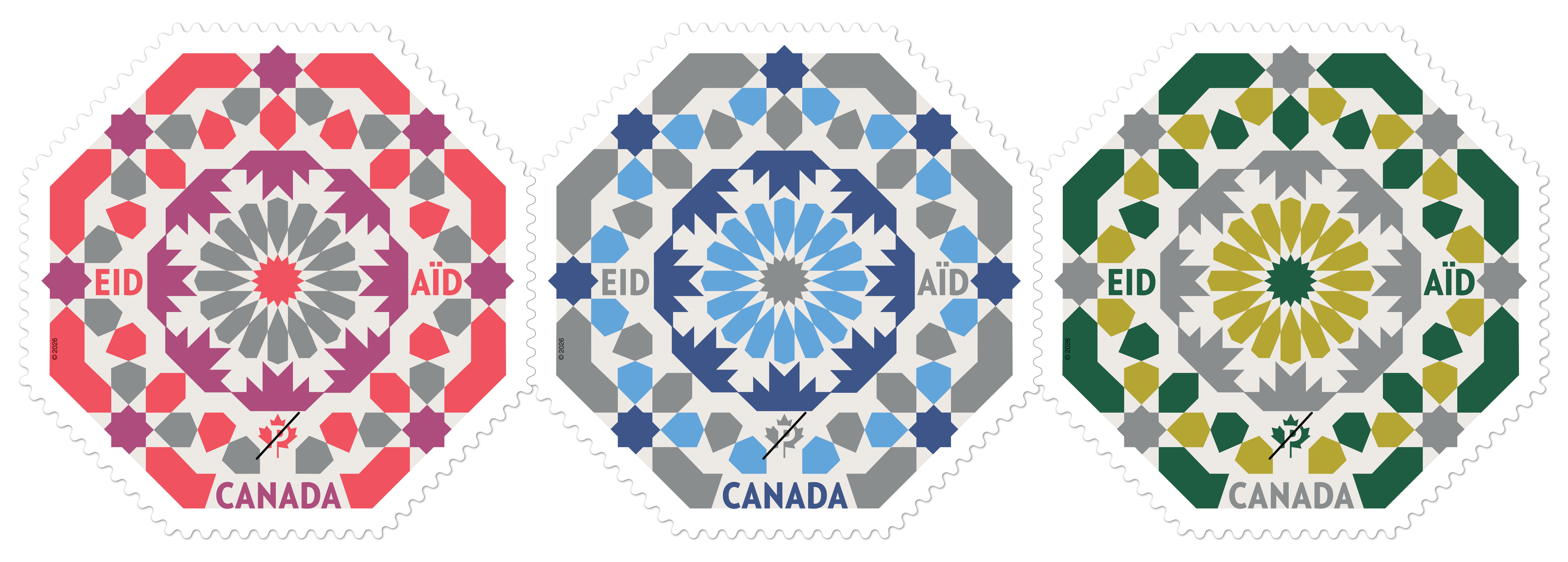 The three-stamp issue incorporates stylized maple leaves into a traditional Islamic pattern to reflect Canada’s cultural diversity and inclusivity. Featuring the same design in different colour palettes, the stamps honour the significance of Eid for Muslim communities across the country.
