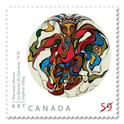 Ottawa, Ontario - Aujourd’hui, Postes Canada a émis trois timbres mettant en vedette des œuvres de l’artiste canadienne d’origine autochtone Daphne Odjig. Les figurines illustrent trois acryliques réalisées par la peintre. Chaque tableau, Renouveau spirituel (1984), Le danseur de pow-wow (1978) et Pow-wow (1969), est représentatif de sa passion pour les arts et de son amour pour le patrimoine de ses ancêtres.