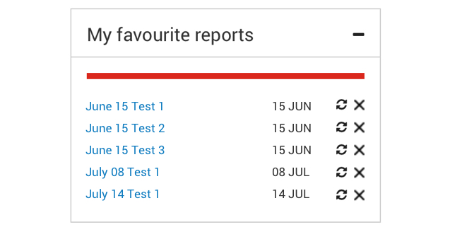View the reports you have added to favourites and the five most recent reports created in the past 30 days.
