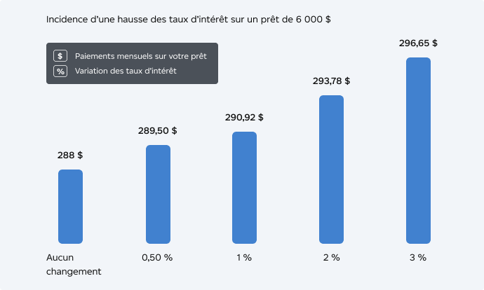 Selon votre contrat de prêt, vos paiements pourraient soient augmenter en fonction de la hausse des taux, soit rester les mêmes. Dans ce cas, la période de récupération du prêt s’allongerait. Vérifiez les modalités du contrat auprès de votre prêteur avant la signature.